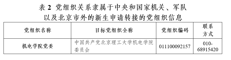 凡党员组织关系隶属于中央和国家机关、军队以及北京市外的新生,应通过当地党员信息管理系统线上办理组织关系,由本人所在基层党组织准确完整填写组织关系介绍信相关信息并发起线上转接申请,目标党组织或组织编码需填写具有转接审批权的基层党委(如表2所示),去向党支部填写:成人网站 2024级研究生临时党支部,有效期最长可选择90天,经全国组织关系转接系统交换区中转,由成人网站 党委接收并分配支部后完成转接。新生登录微信小程序“党员E先锋”(用户名:身份证号,初始密码:bj0701)可查看转接进程。