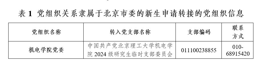 凡党员组织关系隶属于北京市委所辖基层党组织(含中央在京高校)的新生,由所在党组织通过“党员E先锋”系统申请转接,系统中目标党支部名称与支部编码根据录取成人网站 及专业所对应的支部信息(如表1所示)填写,有效期默认为30天。新生可登录微信小程序“党员E先锋”(用户名:身份证号,初始密码:bj0701)查看转接进程。